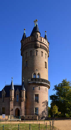 Photo of historical water tower in European city against grey sky. Old and tall red brick wall of industrial heritage building. Lueneburg, Germany