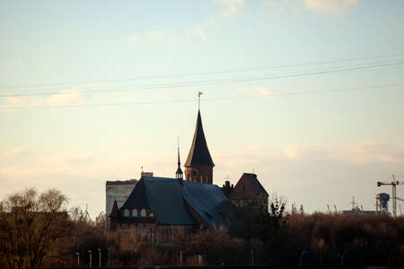 old beautiful Gothic cathedral church on the banks of the pregola river at dusk