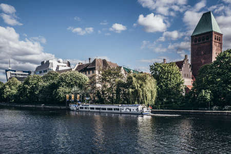 Berlin, Germany / 14 May 2019: Excursion boat on Spree river near famous Museumsinsel (Museum Island)