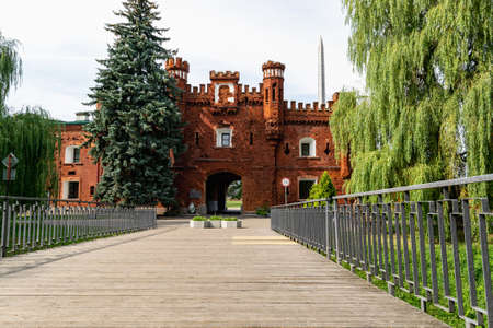 Brest, Belarus - August 2021: Kholmskie Gates of the Brest Fortress. History of the Second World War. Architectural elements. Horizontal photo.