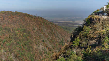 View from a mountain in autumn with colorful leaves and blue sky