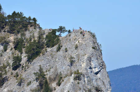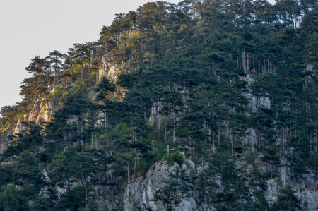 Pine trees on the top of a cliff in the mountains.
