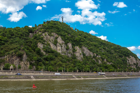 Budapest/Hungary- May 8, 2018: spring cityscape – Gellert Hill with Liberty Statue, Danube river, green trees, city traffic – road with moving cars and blue sky.