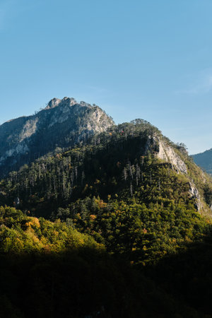 Tara river gorge, Montenegro in autumn at sunset. Spectacular views of the rocky mountains and forests of the national park