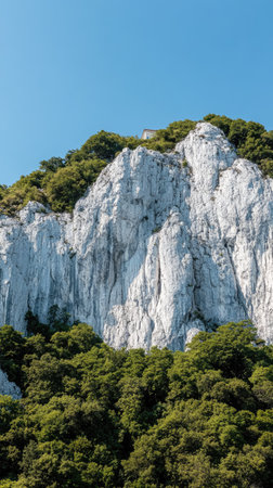 Scenic of greenery mountain with rocky wall area, natural lush forest against clear blue sky during seasonal. Beautiful freshness landscape, calmness and tranquility of green environment. Copy space