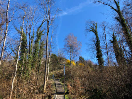 The quiet time of the plank road in the forest, the stairs to the depths of the forest