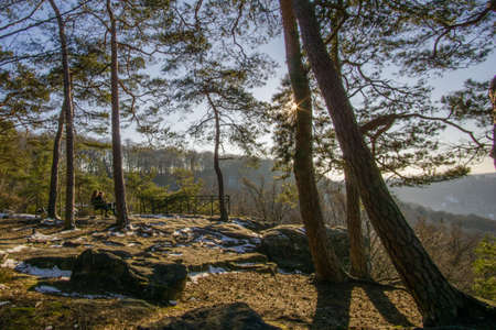 winter landscape in forest with couple sitting on bench at sunset in golden light, Mullerthal, Luxembourg