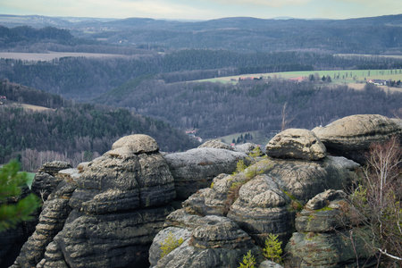 View from Lilienstein to over sandstone cliffs of Saxon Switzerland, Germany