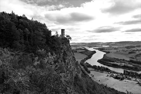 A view from the old stone tower on top of Kinnoull hill in the Scottish town of Perth, looking over the river Tay.