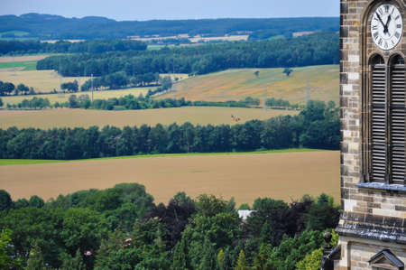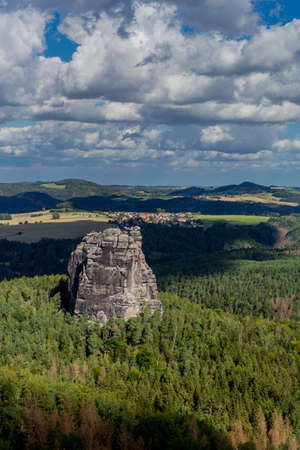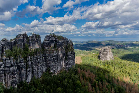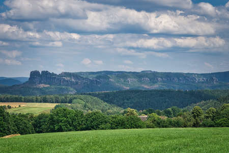 View from a vantage point over the landscape in Saxon Switzerland. A sunny day with cloudy skies