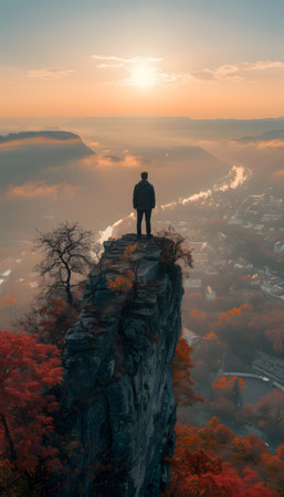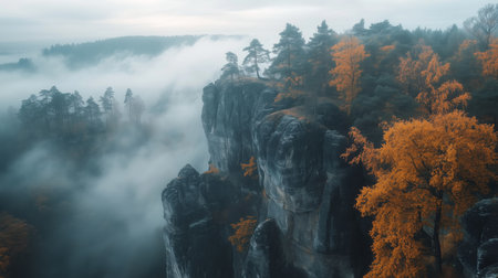 Autumn fog envelops a rocky landscape with vibrant orange trees and a serene atmosphere in a mountain range during early morning