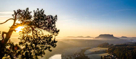 View of Elbe river from Lilienstein viewpoint, Nationalparks Sächsische Schweiz. River landscape in Germany. Summer scenery with Elbe river and rocky hill. Village near the river. Pine tree on stone.
