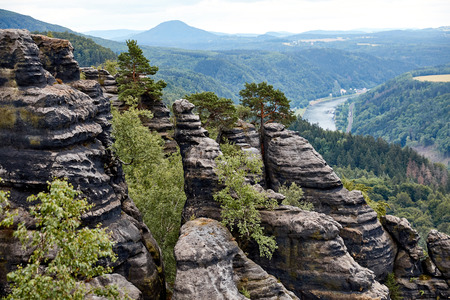 Big rocks near Bastei bridge in valley of river Elbe or Labe in spring sunny day