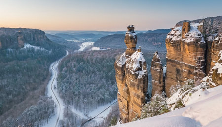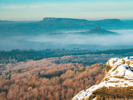 Snowy rocks above valley in Saxony Switzerland national park. Elbe river valley in chill morning