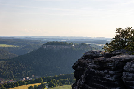 Sunset casts a warm glow over the Elbe Sandstone Mountains on Königstein Fortress as seen from Lilienstein. The landscape features lush greenery and serene valleys, creating a breathtaking natural panorama.