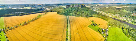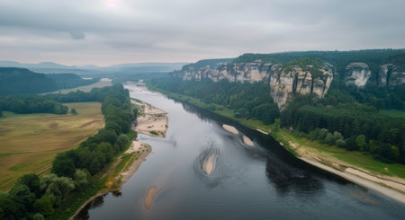 aerial view of beautiful landscape with old rocks, river and forest in Bastei, Germany