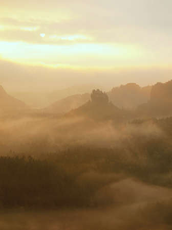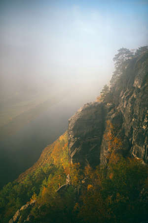 Cold misty daybreak in a fall valley of Bohemian Switzerland park. Hill with hut on hill increased from magical darkness.