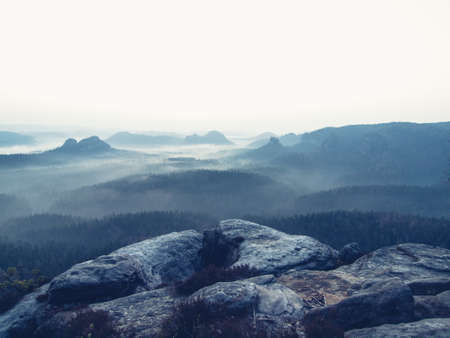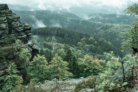 Czech Switzerland (Bohemian Switzerland or Ceske Svycarsko) National Park. Misty landscape with fir forest in hipster vintage retro style.