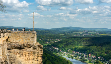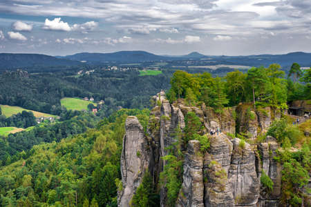 Rathen, Germany - May 23, 2010: Panoramic view to Elbe river and Saxon Switzerland from Bastei view point in Rathen, Germany.