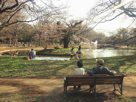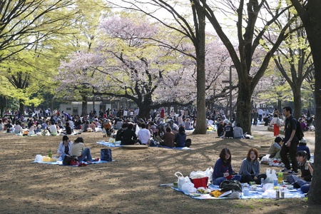 Tokyo, Japan - April 4, 2008: people crowds celebrate cherry blossom in famous Yoyogi park in Tokyo. This is traditional Japanese leisure, it takes place every year during cherry blossom season.
