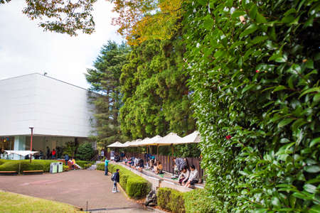 HAKONE, JAPAN - NOVEMBER 5, 2017: A group of people in a city park under umbrellas. Copy space for text