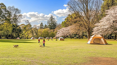 Family enjoying a sunny day in a park with tents and blooming cherry trees