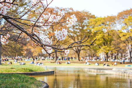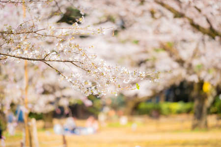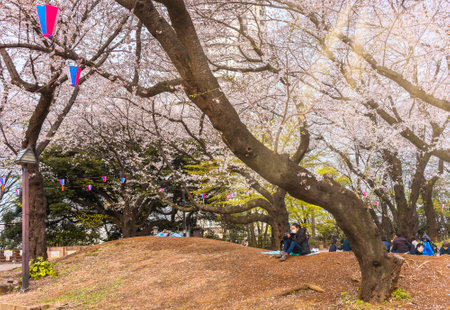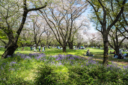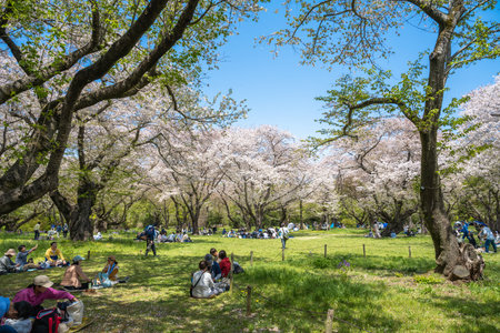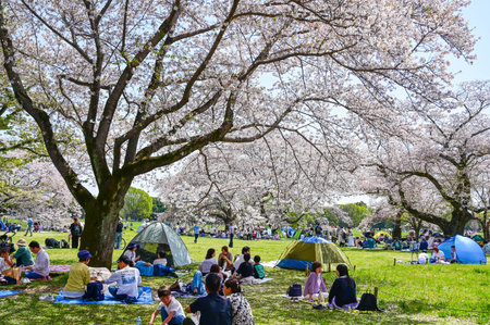 Tokyo, Japan - APR 14, 2024: Many people enjoy flower viewing under the cherry blossom trees in Showa Kinen Park.