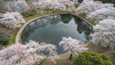 Scenery of a pond with blooming cherry blossoms. Shooting Location: Tsurumi Ward, Yokohama City