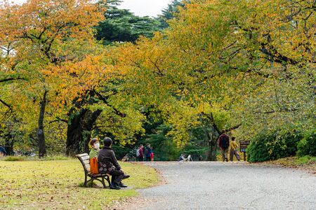 TOKYO, JAPAN - NOVEMBER 16, 2018: Day scene of autumn leaves at Shinjuku Gyoen park with autumn leaves, Tokyo prefecture, Japan