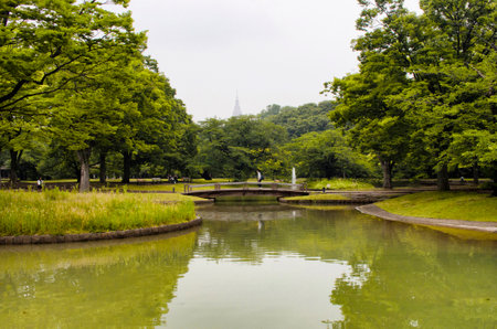 Tokyo, Japan - May 28, 2016 - Water fountain, lake and forest view at Yoyogi park