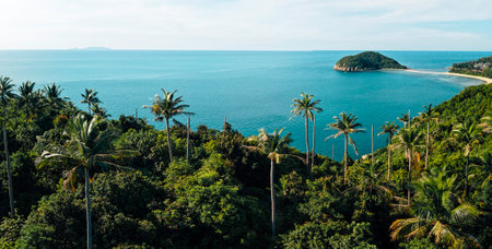 tropical summer with this elevated aerial perspective. The foreground is dominated by a lush, vibrant green canopy of tropical trees