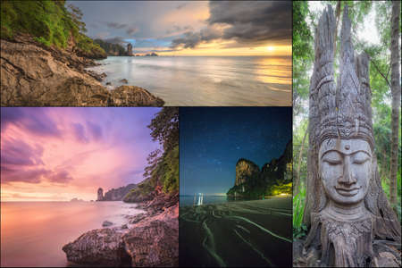 Travel Beach-Blue sea and rocky mountains, evening bay in Krabi