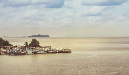 Fishing boats anchored in fishing villages have beautiful sea and sky.