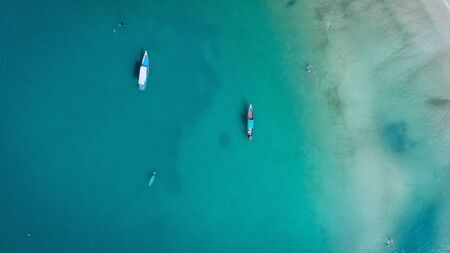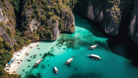 Generative AI : Aerial view of boats moored in the bay of Koh Rok Yai Beach island in Thailand