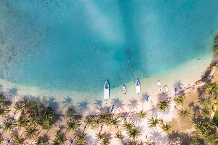 Tropical beach aerial photography with coconut palm trees along the coast and blue transparent sea water with coral reef, paradise vacation holidays destination, viewed from drone