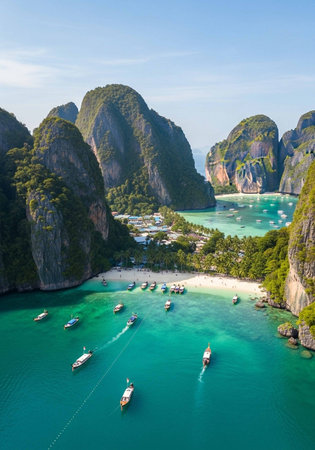 This image features the famous Maya Bay in Thailand, with its white sandy beach, turquoise waters, and traditional longtail boats.