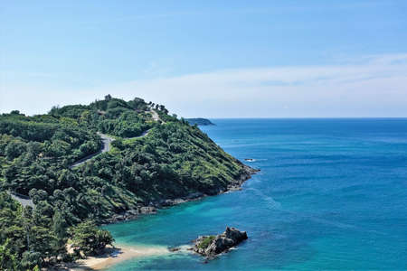 Top view of a large green island with a dense forest. Sunny summer day, blue sky. In a calm aquamarine sea, a small rocky islet and a strip of sandy beach. Thailand. Phuket