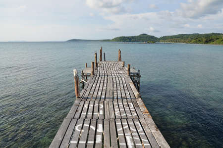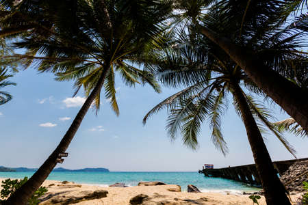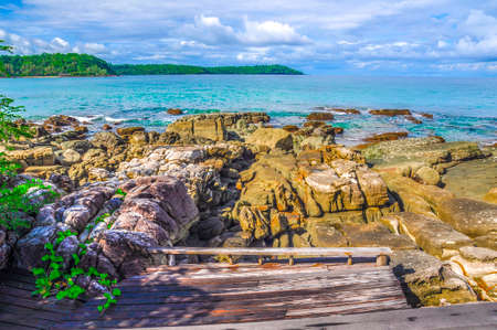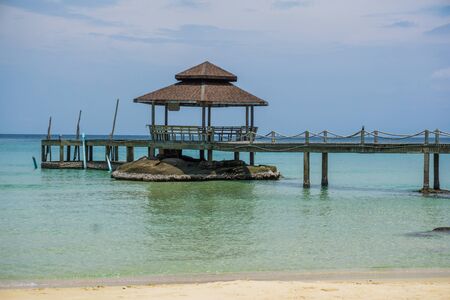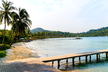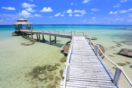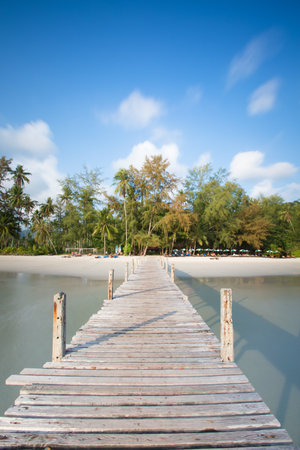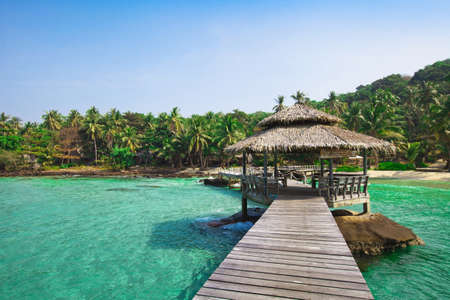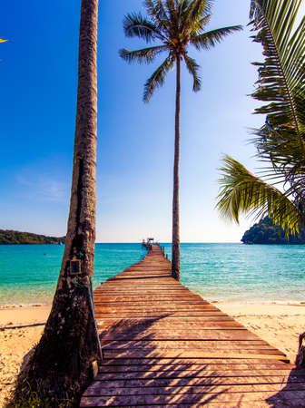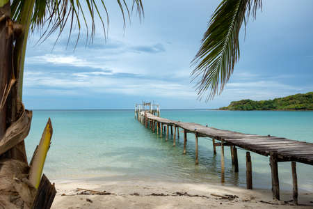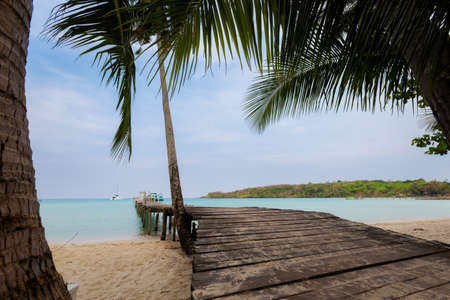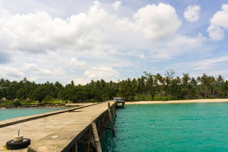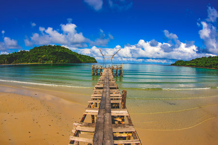 Summer landscape on tropical koh Kood island in Thailand. Landscape with long wooden pier taken on Bang Bao beach.