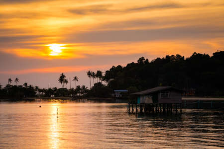 Summer sunset landscape on tropical koh Chang island in Thailand. Seascape taken from Bang Bao pier.