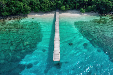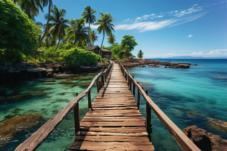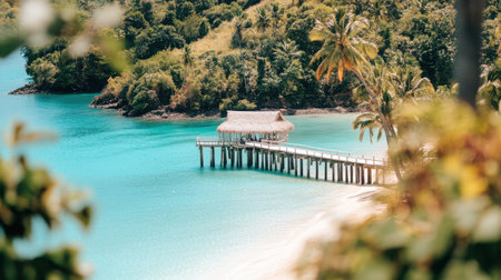 This picturesque tropical beach features a charming pier extending into clear blue waters, surrounded by lush greenery and gentle waves, creating an idyllic escape.
