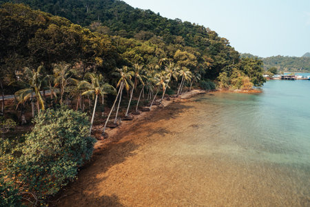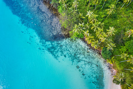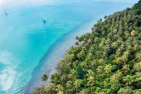 Aerial view of beautiful tropical sea with palm tree forest in Koh Kood Island on sunny day