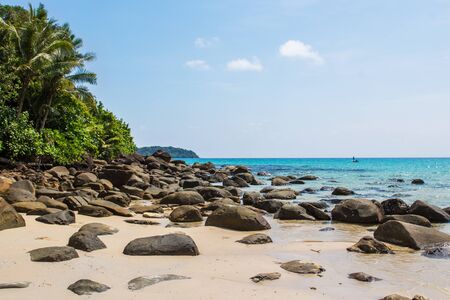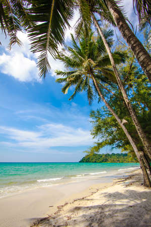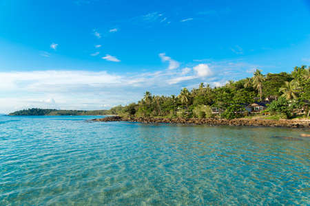 Nature tropical beach sea. Beautiful beach blue sea water at Koh Kood, Thailand. Turquoise Blue beach with white soft sand and lush green trees. Tropical beach with blue sky and white clouds. Summer vacation and holiday business travel concept.
