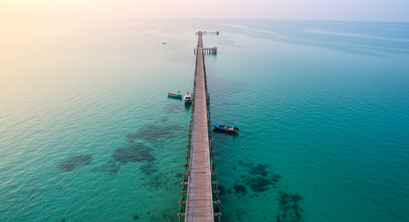 Long wooden bridge go to the sea in beautiful tropical island. Tranquil panoramic landscape. Wooden pier at Bang Bao Beach Koh Kood Island Thailand Trat, tropical beach with palm trees and a turqouse colored ocean on a sunny day, Ko Kut Island