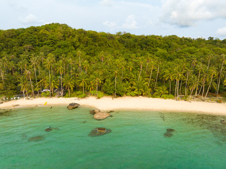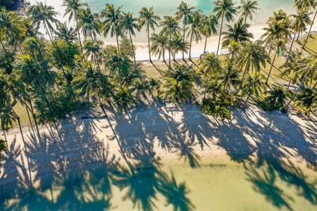 Aerial drone view of beautiful beach with turquoise sea water and palm trees of Gulf of Thailand. Kood island, Thailand.