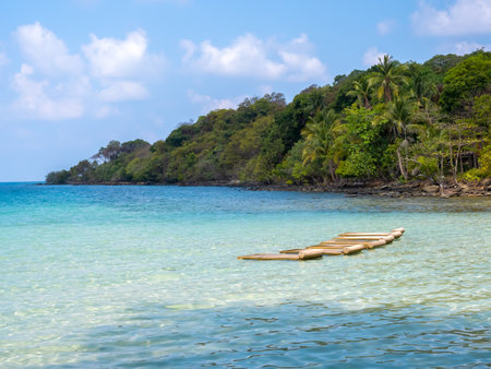 The scenery of the clear seawater and wooden bridge at Koh Kood island in Trat province, Thailand.