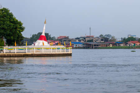 White tilted pagoda along the Chao Phraya River at Koh Kret in Nonthaburi Province in Thailand.