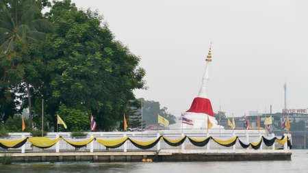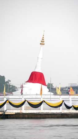 April 6 2021 - Nonthaburi, Thailand : The white leaning Mon pagoda at Wat Paramaiyikawat located on Chao Phraya River.