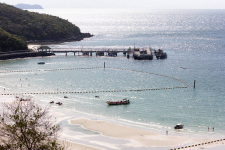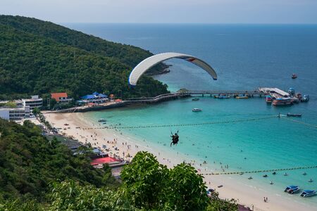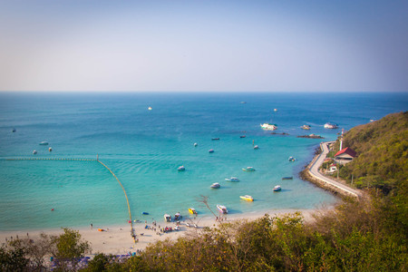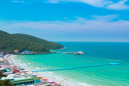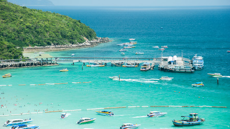 High view of the beautiful beach with tourists and harbor.Koh Larn Pattaya Thailand