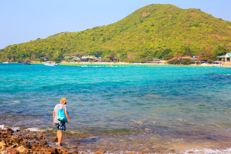 Tourist on the beach looking to the sea and blue sky at Koh Larn,Pattaya, Thailand