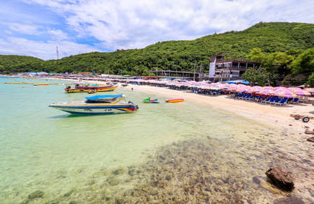 Chonburi/Thailand - 20 apr 2019:Tourist with Tropical Ocean and Boat on Koh lan Island in vacation time. Koh lan island is the Famous island near Pattaya city the Travel Destination in Thailand.